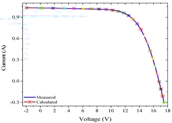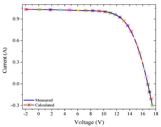 The I–V curve of the calculated and measured currents for the given voltages is plotted in Figure 11. This figure depicts that the calculated current is in proximity to measure the current. The P–V curve shown in Figure 12 was drawn utilizing the calculated currents and given voltages. Table 9 presents the I–V data of the measured and calculated values with IAE.