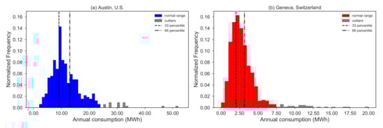 Two datasets of measured electricity demand from 305 dwellings in Austin (U.S., from the Pecan Street project) and 636 in Geneva (Switzerland) are used in this study, both with a temporal resolution of 15-minute throughout the year 2015. This temporal resolution provides a reasonable compromise between modeling technology performance and computational speed []. Figure 1 presents a normalized histogram (it shows the proportion of cases that fall into each of several categories, with the sum of the heights equaling 1) of the electricity demand data from Austin and Geneva. Households in Austin have a median electricity consumption of 10.4 MWh p.a. (within a range of 2.9–23.9 MWh p.a.), while households in Geneva have a median electricity consumption of 2.5 MWh p.a. (within a range of 0.2-–7.4 MWh p.a. In terms of average yearly electricity consumption the American households use 4.2 times more electricity than Swiss households from the datasets.