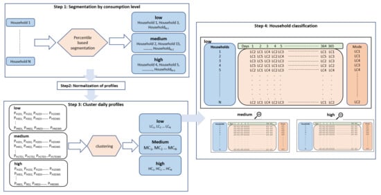To generate representative consumer groups, we employ a clustering method. A range of clustering methods has been employed to form consumer segments in the previous literature (for a review of the clustering techniques applied to electricity load data see []). The k-means clustering method is one of the most widely used due to its versatility and applicability to large datasets [,,,]. Furthermore, it is important to normalize the smart meter data to identify time series with equivalent consumption patterns, instead of identical annual consumption [,]. While this approach is successful for forming groups of load profiles with similar shapes independent of consumption magnitudes, in this work we also need to study the effect of differing levels of overall consumption. Additionally, averaging the data suppresses the diversity of the electricity use patterns within the individual household. Therefore, it is important to find a robust analysis to identify clusters that explain the daily load profiles. Figure 2 shows the methodology used in this study to cluster and characterise the households in Geneva and Austin separately depending on the load patterns they exhibit, divided into four steps: segmentation by consumption level, normalization, clustering daily profiles and household classification.