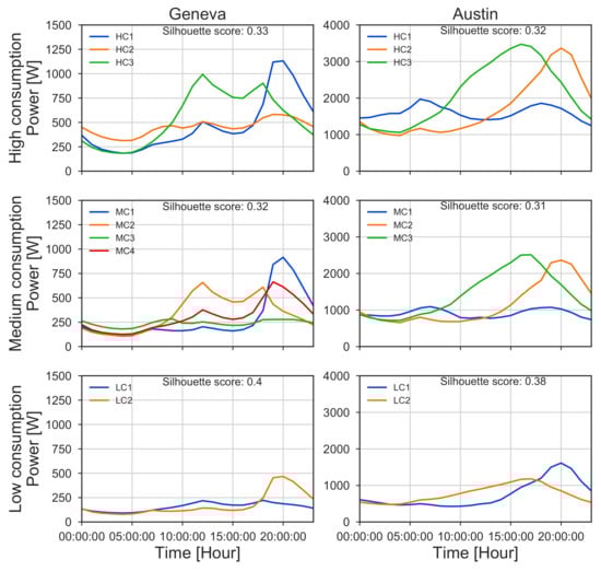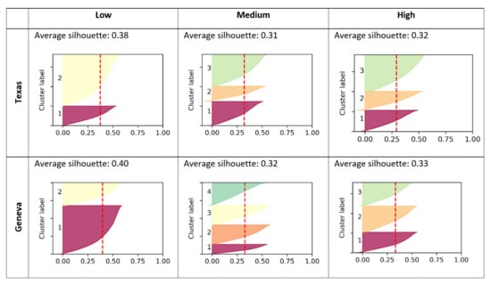 Table 4 presents the distribution of cluster IDs (i.e., the statistical mode of daily profiles) for each consumption level and location, including number and percentage of households. Figure 4 shows the cluster centroids for daily electricity load profiles with their average silhouette score for each sub-group and location. In Geneva two clusters with similar shape are present across the three consumption brackets, one with a high peak in the evening and one that is mostly flat. In Austin, there are as well two similar clusters across the three consumption brackets with one high peak around 16 h, the second one presents a high peak around 20 h. The optimal number of clusters k for each approach was determined based on the highest silhouette score. The silhouette analysis, displayed in Figure 5, shows the optimum number of clusters for each combination of location and consumption bracket: k = 2 for Texas-low; k = 3 for Texas-medium; k = 3 for Texas-high; and k = 2 for Geneva-low; k = 4 for Geneva-medium; k = 3 for Geneva-high. The silhouette scores improve as more aggregation/averaging of profiles is applied, with the best scores resulting from aggregating each day across all households and the worst scores for the approach without aggregation (here in this paper we cluster one profile per household per day hence silhouette scores are slightly lower than those published in literature for average profiles).