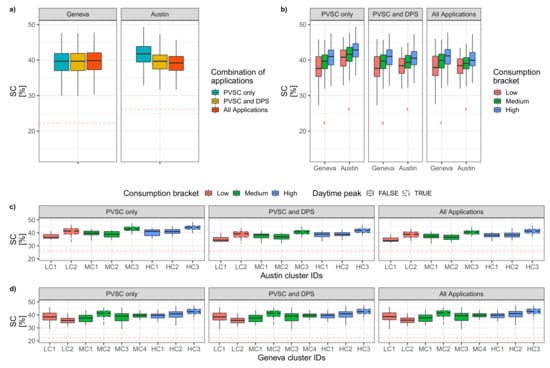 Regardless the combination of applications, the PV self-consumption increases with electricity consumption in both countries (p-value < 0.05). However, this increase is small, with median differences between the low and high consumption brackets of only 2% and 3% for Austin and Geneva, respectively (see Figure 6b). The load profile influences PV self-consumption (p-value < 0.05) and it can differ by up to 5% (e.g., LC1 vs. LC2 in Austin, see Figure 6c), while it is more limited when comparing households with a peak during daytime (dashed boxplots in Figure 6c,d, e.g., MC2 and HC3 in Geneva) with those without a daytime peak, with maximum median differences of 4% and 2.5% for Austin and Geneva, respectively. Overall, the addition of a battery significantly increases the self-consumption, especially for households with a peak during daytime; the low penalty related to combining all applications suggests that it is a smart strategy to follow.