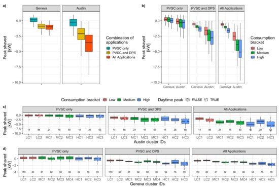 Peak flow shaved by PV-coupled batteries. (a) Comparing the impact of the combination of applications per country; (b) Comparing the consumption bracket impact per country and per combination of applications; (c) Comparing the impact of the load profile (cluster) per consumption bracket and per combination of applications for Austin and; (d) Comparing the impact of the load profile (cluster) per consumption bracket and per combination of applications for Geneva. Dashed boxplots represent households with peaks during daytime (i.e., from 10 am to 6 pm). The number of observation per cluster is indicated on top of the boxplots. PVSC stands for PV self-consumption and DPS for demand peak shaving.