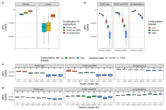 NPV achieved by PV-coupled batteries. (a) Comparing the impact of the combination of applications per country; (b) Comparing the consumption bracket impact per country and per combination of applications; (c) Comparing the impact of the load profile (cluster) per consumption bracket and per combination of applications for Austin and; (d) Comparing the impact of the load profile (cluster) per consumption bracket and per combination of applications for Geneva. All values presented in this graph refer only to the investment in the battery, i.e., the cost of the PV panel is excluded. Dashed boxplots represent households with peaks during daytime (i.e., from 10 a.m. to 6 p.m.). The number of observation per cluster is indicated on top of the boxplots. PVSC stands for PV self-consumption and DPS for demand peak shaving.