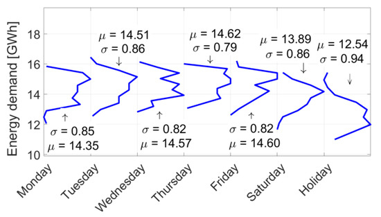 Table 1 shows the statistical characteristics of the energy demand profile. Weekdays presented similar mean and median in the energy demand, on the contrary to Saturdays and Sundays/holidays. Table 1 reveals that there was data concentration to the left of the mean due to the reported positive asymmetry. Similarly, kurtosis values were similar for all types of days and lower than three, showing a shape not as sharp and with wider tails compared to a normal distribution.