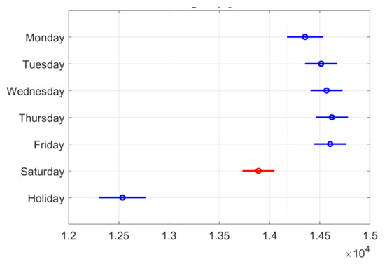 On the other hand, Figure 9 shows the energy demand distribution for all types of days for each considered period. This figure represents the summary characteristics of Table 1. The energy demand data distribution for each type of day was mostly concentrated toward the left of the mean, while the variance was approximately equal for every case. A multicomparison was used to verify the existence of statistical differences in the mean of the energy demand for each type of day. Figure 10 confirms the results of Figure 8 and Figure 9.