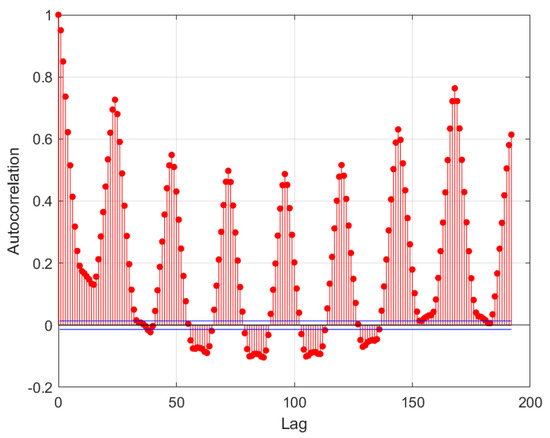 The autocorrelation function in Figure 12 shows a high correlation between each of the previous energy demand data and the seasonal nature of that demand. The importance of historical data for the generalization of a stationary process behaviour is clear.