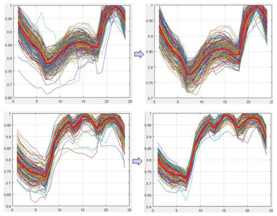 An inverse clustering technique was implemented to smooth the curves. This process considered the four most similar curves to the obtained curve after the intelligent correction. Such curves became a reference to adjust the trace of the corrected curve and reduce the ripple to obtain the required smoothing (see Figure 15).