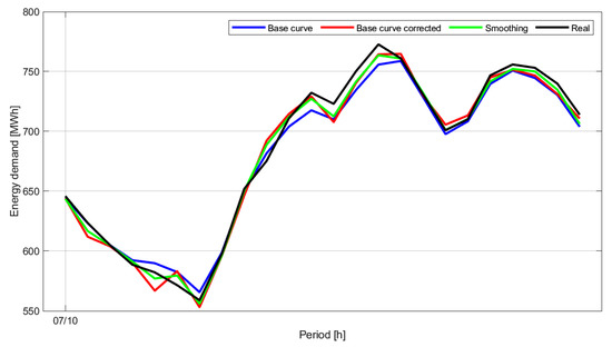 The second stage obtains the base curve for forecasting the energy demand for each of the considered days. The goal was to generate the base curves as accurately as possible to minimize the possible corrections. Thus, the base curve was a preliminary prediction, which was obtained using statistical techniques, and it was be corrected at the final stage of the proposed methodology.