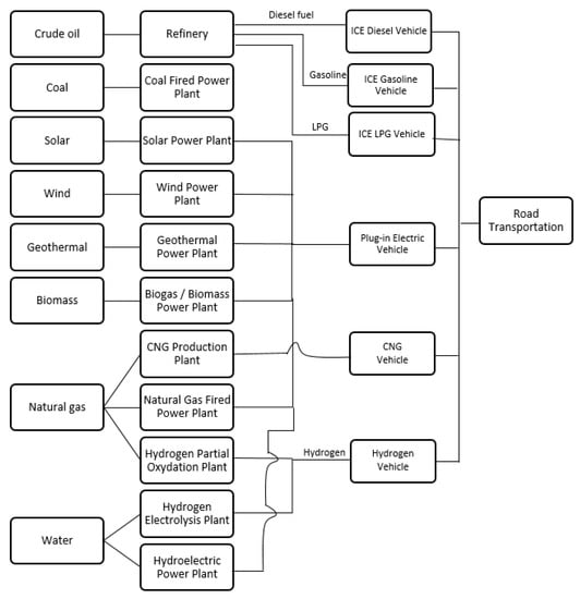 Globally, the energy sector is the main contributor to CO emissions followed by transportation. For example, the International Energy Agency [1] indicates that global CO emissions from fuel combustion in 2017 were 32.8 Gt, growing from 32.3 Gt in 2016. The report highlights that electricity/heat generation and transport account for two-thirds of total CO emissions and were equally responsible for almost the entire global growth in emissions since 2010. Emissions from the transport sector account for approximately a quarter of energy-related CO emissions worldwide, while road vehicles account for nearly three-quarters of transport CO emissions. In the Fifth Assessment Report (AR5), the Intergovernmental Panel on Climate Change (IPCC) highlights that emissions from the transport sector have been increasing at a faster rate than any other energy end-use sector [2,3]. Emissions from transportation are on the rise, essentially due to greater overall volume of travel that outweighs improvements in the energy efficiency of vehicles.
