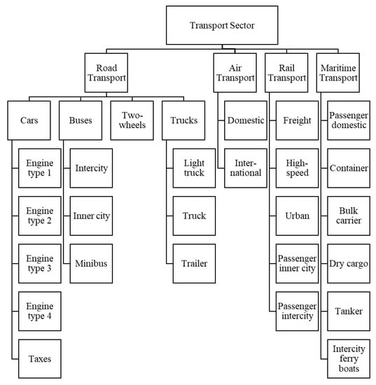 In BUEMS, the transport sector is grouped into four major modes: air, maritime, rail and road transportation. These major modes are also divided into sub-modes, as shown in Figure 3.
