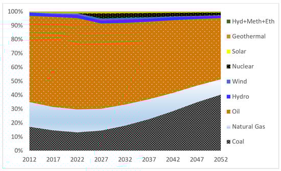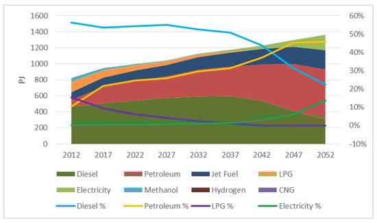 The total energy consumption of transportation includes electricity, petroleum, diesel, biodiesel, hydrogen, jet fuel, CNG, LPG, ethanol and methanol as fuel types, as shown in Figure 4. According to the results of the base scenario, diesel fuel is the dominant fuel from the beginning of the planning horizon, 56.4% in 2012 and 53.4% in 2017. However, its share in total transport energy consumption decreases over time, reducing to 31.5% in 2047 and 22.5% in 2052 being essentially substituted by gasoline fueled vehicles and EVs. The increase in the use of petroleum use is a result of the substitution of gasoline for diesel fueled vehicles and the increase in the demand of residual fuel oil used in ships, together with the rapid increase in overall transport demand. Its rising share indicates the long-run price competitiveness of petroleum. Electricity consumption in transportation gradually increases because of electric car deployment with a share of 0.3% in 2012, 0.5% in 2017, 6.3% in 2047 and 13.8% in 2052. Hydrogen fuel, which has no incentive in the model like plug-in EVs, gets involved at the end of the planning horizon only with a consumption of 1.6 PJ in 2052. While jet fuel and petroleum consumption continue to grow depending on the increase of transport demand, methanol consumption decreases for each period. Lastly, LPG, which is being used because of economic reasons in Turkey as it is cheaper than other alternatives being subsidized, drops over time from a considerable share of 15.49% in 2012, becoming zero by the year 2047 due to a considerable increase in electric cars.