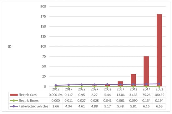 The electricity consumption of the transport sector is dominated by electric cars. While it is negligibly small in 2012 and only 0.1 PJ in 2017, it reaches 75.2 PJ in 2047 and 180.6 PJ in 2052, as shown in Figure 5.
