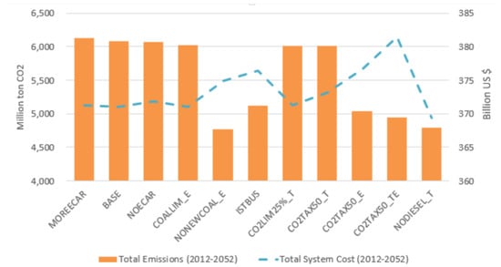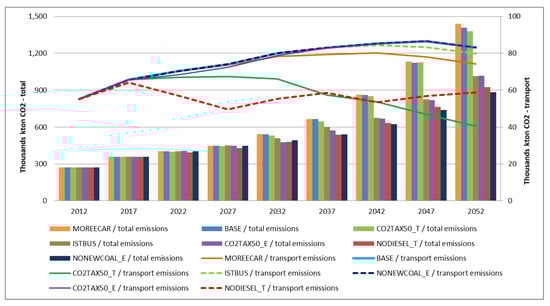 CO emissions are increasing in all scenarios; total emissions of the BASE scenario skyrocketed from 359,280 kton in 2017 to 1,408,500 kton in 2052, which is almost quadruple. Transport sector emissions are increasing from 65.6 kton in 2017 to 83.1 kton in 2052 implying a 26.7% increase. Most interestingly, the more EVs are deployed, the higher the total emissions, as can be observed by comparing the MOREECAR and BASE scenarios in Figure 6. This is because of increased coal usage for power generation; therefore it is essential to limit the expansion of coal. That is why all other scenarios have a limitation or policy in place to reduce coal usage. When the results of these scenarios are investigated it is seen that emissions decrease by 0.4%, 4%, 11%, 29% and 51% in 2052 for the CO2TAX50_E, ISTBUS, MOREECAR, NODIESEL_T and CO2TAX50_T scenarios, respectively, in comparison to the BASE scenario.