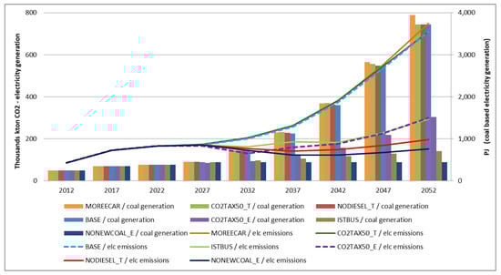 Emissions from electricity generation and coal-based electricity generation levels by scenario.