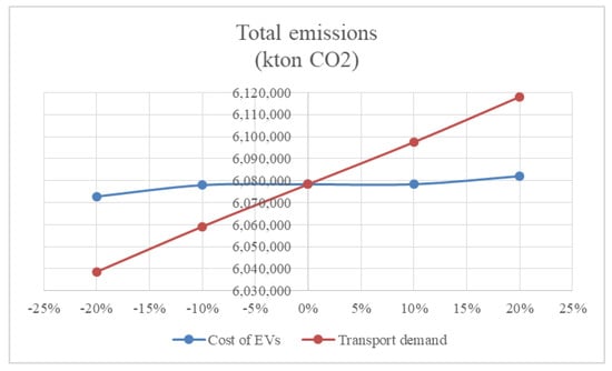 Total emissions change with different data for transport sector demand and cost of electric vehicles (EVs) in the base scenario.