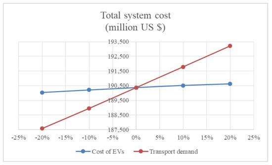 Transport sector demand data and the cost of EVs are among the most important parameters affecting scenario results in this study. Therefore, the sensitivity analysis focuses on these two parameters, thereby elaborating on their impacts on CO emissions and energy system costs. It is found that the results are much more sensitive to demand than to the cost of EVs. According to Figure 11, a 20% rise in transport sector demand causes a 0.7% increase in total emissions while 20% rise in EV cost causes less than 0.1% increase. On the other hand, a 20% fall in EV cost reduces emissions by 0.2% while a 20% fall in transport sector demand provides a 0.7% decrease.