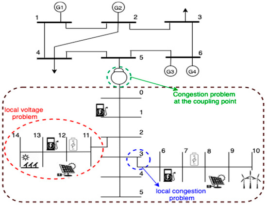 In order to evaluate our proposed model and framework, we use a 6-bus test system with four conventional generators and two load buses. A 15-node radial DN is connected to bus 5 (Figure 1). The transmission grid lines, generators and load data can be found in [23]. Loads are located on nodes 1, 2, 3, 4, 6, 7, 10, 11 and 12 of the DN. Load and line data for the DN are based on data in [24] and can be found in our recent work in [25]. We discretize the time horizon into 24 hourly timeslots. The interested reader can find extensive details about all the input data and performance evaluation results of this paper in [26].