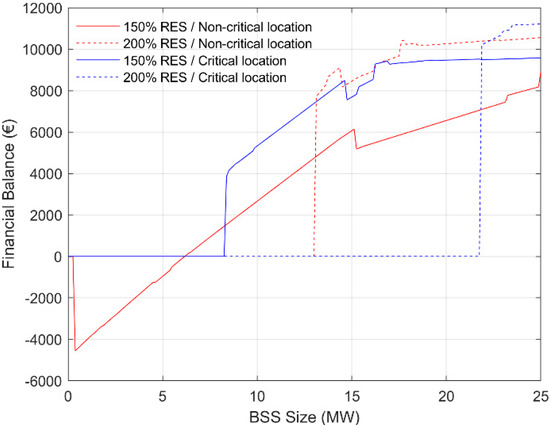 Figure 2 depicts the financial balance (profit/deficit) that MGO has as a function of BSS size. BSS is needed in order to keep the distribution network within its operating limits and avoid, in this way, a RES spillage phenomenon. Note that the size of BSS highly depends on the siting and the sizing of the RES units (which is depicted and handled as an input parameter in the two subcases). In Figure 2, zero financial balance implies an infeasible distribution network operation. In other words, the MGO will have to pay the very high Value of Lost Load (VOLL) for all the time that the network is in an unstable condition. Positive and negative financial balance implies that MGO has profits and deficit, respectively. In the non-critical location case and for 150% RES penetration, MGO needs to install at least 375 kW of total BSS power capacity in order to safely operate its network, while for 200% RES penetration, it needs to install at least 13,130 kW BSS. In the critical location case and in the subcases of 150% and 200% RES penetration, the MGO has to install at least 8375 and 21,880 KW of BSS power capacity, respectively. We see that, in these specific setups and under both the non-critical and critical location cases, 200% RES penetration requires the most BSS power capacity and leads to more market profit for the MGO, but this comes at the expense of higher BSS investments. Given the very high VOLL, the eligible distribution network nodes that are to put more RES units in in the future are the ones in the “non-critical” case. This is quite important for the MGO’s business model in order to be able to prioritize the installation of its future RES and respective FlexAssets in the correct nodes of the distribution network.