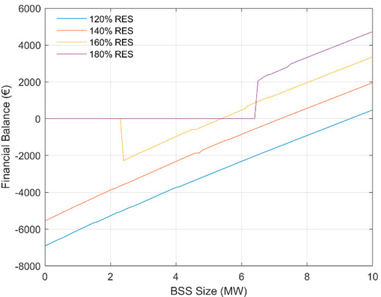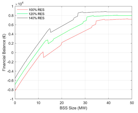 Figure 4 depicts MGO’s financial balance as a function of BSS under the three aforementioned subcases. From Figure 4, it is observed that, in all RES penetration cases, the MGO’s financial benefit increases with the total power capacity of the BSS, up to a saturation point. This is the optimal BSS sizing. Beyond this BSS size, the MGO does not gain any more profit, corresponding to an over-investment context that should be avoided by the MGO. It is highlighted that in the higher RES penetration subcase, the MGO’s profits stop increasing for less BSS capacity (29,000 kW) than in the other two subcases (33,500 and 38,000 kW for 120 and 100% RES penetration, respectively). This is because the less RES production capacity is installed in the distribution network, the more the FlexAssets are dispatched in order to maximize MGO’s profits by employing temporal arbitrage.