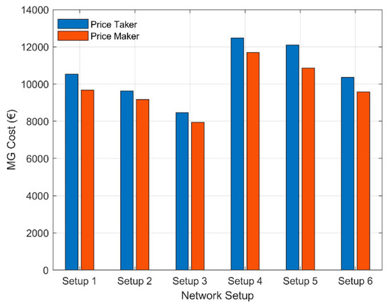 So far, we have only examined high RES penetration cases that will most probably appear in some years from now. However, we ask, how could an MGO lower its energy costs today where it possesses a relatively low amount of local RES and FlexAssets and it mostly draws power from the higher-level transmission grid? Therefore, we now evaluate the market-aware bidding property of our model to minimize the energy cost in a more realistic today’s low RES penetration scenario. In this scenario, the MGO is a price-maker market entity (i.e., we model the affection in the prices of the wholesale energy market that MGO’s bidding policy has). We compare the price-maker algorithm to the price taker solution. In more detail, Figure 5 depicts the MGO’s cost under six network setups with low RES penetration (in this scenario the financial balance is always negative, and we note it as “MG cost”). In the first three network setups of Figure 5, we assume 80% RES penetration and in the last three, 60%. In setups 1 and 4, MGO decides to invest only in DSM (i.e., 35% of the nominal peak load can be shifted) and not at all in BSSs. In setups 2 and 5, the MGO has 500 kW of BSS power installed and 30% of the nominal peak load DSM capacity. Finally, in setups 3 and 6, the installed BSS power capacity increases to 2000 kW, while the DSM capacity remains at 30% of the nominal peak load. As can be seen in Figure 5, our algorithm outperforms the price taker solution in every setup by an average percentage of 8% in terms of the MGO’s energy cost. This indicates that, even if its portfolio represents a small portion of the wholesale market, the MGO can achieve a significantly smaller energy cost by acting strategically and implementing our proposed model, as opposed to adopting the price taker solution.