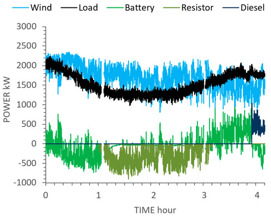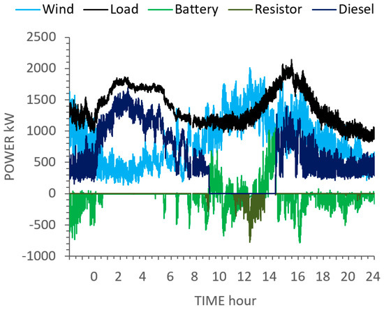 To allow for extended diesel off operation, a 3 MW, 1.5 MWh advanced lead acid BESS was integrated in 2014. The battery extended the time for which the system could remain diesel off, having accumulated over 12,000 h of diesel off operation to date. A typical daily load and generation profile is shown in Figure 5, with the twin peak load profile evident. The plot shows a five-hour diesel off period from midday, as the afternoon sea breeze produces surplus renewable generation. Throughout this period, the battery transitions from an energy source (hours 9–10) to a sink (hours 10–11), until the resistor is deployed to spill surplus renewable (hours 11–1). As the afternoon load peaks, diesel generation is again brought back online. The battery charges into the evening, indicating the inability of diesel generation to reduce its output below its operational low-load limit. The role of low-load diesel within the King Island power system is to reduce the occurrence of excess renewable generation. This is achieved by permitting the low-load diesel unit to run down to 10% of its rated capacity during periods of high wind generation.