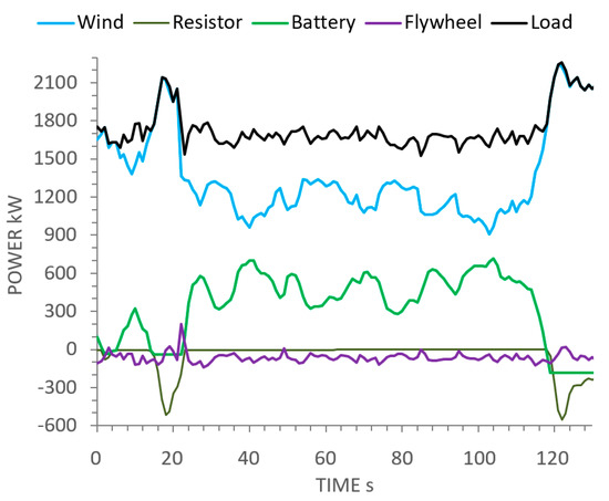 King Island flywheel (purple) response to rapid loss of wind generation (light blue), supporting battery response (light green) and ride through.