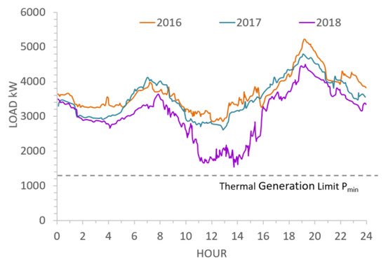 Moloka`i average daily load profile 2016 (orange), 2017 (blue) and 2018 (purple). Note the reduction in midday load under increasing solar photovoltaic (PV) penetration [19].