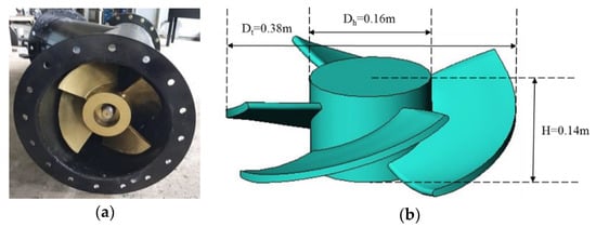 The turbine runner was designed on the basis of free-vortex theory combined with Euler’s head equation; the design process of the turbine runner was presented in detail in previous research performed by Tran et al. [18]. The well-known free-vortex theory originally comes from the law of conservation of angular momentum that was applied in designing several types of compressible and incompressible flow machinery [19,20]. The current surveyed turbine was developed to operate with a gross head of 2 m, a rated flow of 0.25 m3/s, and a rotational speed of 450 rpm. The turbine runner consisted of four constant-thickness blades formed by sections with the pitch-to-chord ratio in the range of 0.7–0.9 (from hub to tip). Relying on the calculated parameters of the chord length, blade inlet angles, and blade outlet angles for all blade sections (refer to [18]), the 3D geometry of the blade runner was created with BladeGen—a packet in ANSYS Workbench. The manufactured rotor of the propeller turbine was made of Nickel Aluminium Bronze Alloy (ASTM B 505 C95800), which contained 9% aluminium, as well as additions of iron and nickel for strength. The 3D design geometry and manufactured model of the turbine runner blade are displayed in Figure 1, and the main turbine design parameters are presented in Table 1.