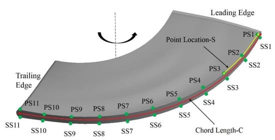Tip-clearance size in this study is referred to as a non-dimensional value and can be determined by Equation (1). The blade chord fraction defining the monitoring point’s position along the blade chord from leading edge to trailing edge is specified in Equation (2).