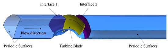 The reliability of the numerical calculations is related to the quality of the computational gird. In the current study, all domains were computationally discretized on the basis of structured hexahedral elements using the TurboGrid package in ANSYS Workbench, as shown in Figure 4. The refined mesh was implemented at the blade’s hub and shroud to achieve higher mesh density. Meanwhile, all wall surfaces (including blades and pipes) adopted 10-layer inflation to ensure accurate predictions of the flow field at near-wall regions. The local grid at the tip-gap region was also generated with 30 layers due to the complicated flow pattern in this area, giving rise to better observation of the vortex structure. The Y+ value for the wall grid of the turbine blade was around 1, satisfying the demand of SST k–ω turbulence model to precisely predict flow behavior in the viscous sub-layer [21].
