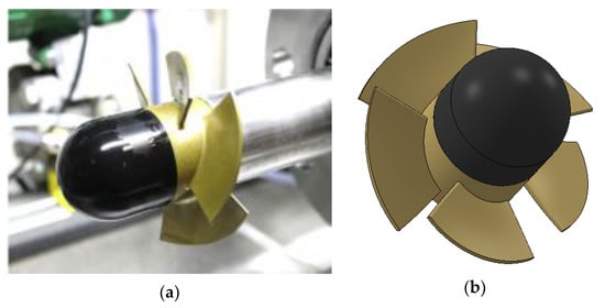 Five-blade propeller turbine. (a) Prototype [26]; (b) obtained 3D geometry for validation.