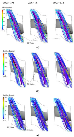In the case of discriminant ∆ > 0, the velocity gradient tensor has one real eigenvalue, λr, and a pair of complex eigenvalues, λcr ± i.λci. The strength of the swirling motion can be qualified by λci, the so-called swirling strength of the vortex. The swirling strength criterion visualizes the vortex by taking the imaginary part of the complex eigenvalue into consideration [27] and this criterion was employed to recognize the TLV trajectory at the tip-gap region in this study. Figure 7 illustrates the TLV trajectory for three tip-gap values, δ = 0.25%, 0.5%, and 0.75%, at three flow-rate conditions, 0.92, 1.0, and 1.12 Qd. The leakage vortex appeared under any flow rate for both design and off-design conditions, while vortex strength and inception location varied according to flow discharge and clearance size. TLV occurrence can be observed in two main types: vortex at the pressure side (PS vortex) and vortex at the suction side (SS vortex). The PS vortex developed by the flow through the tip corner of the blade leading edge, extended along the blade chord length, and likely appeared at low flow rate. The SS vortex, on the other hand, which was caused by pressure disparity between the two sides of the blade, initially formed at around one-third of the blade length (λ = 0.3) with its magnitude surpassing that of the PS vortex. Under partial flow rate, the leakage vortex appeared on both sides of the blade, despite slight dominance of the SS vortex. At the starting point, the PS vortex had a strong intensity, and then the swirling strength was reduced at the vortex tail when it interacted with the main flow within the passage. With increased flow rate, due to the influence of the mainstream, the PS vortex was pushed closer to the blade with a remarkable decrease in swirling. Under excess flow conditions, the PS vortex seemed to be terminated, while the TLV on the blade suction side strongly developed and became the most powerful, indicated by the high density of red vortex streamlines at the vortex core. Another feature is that the relative angle of the SS vortex trajectory to the blade significantly changed as flow rate rose. Higher flow rate not only caused vigorous swirling but also broadened the vortex-blade angle. For instance, in Figure 7c, the rising point of the SS vortex ships toward the blade leading edge, and the relative angle of the vortex core increases from 10° at a flow rate of 0.92 Qd to 20° at 1.12 Qd. A similar relation of the vortex pattern and flow discharge was also described by Zhang, who captured the tip-leakage vortex trajectory on the basis of cavity bubbles with high-speed digital cameras [10]. Due to the change of the blade loading according to flow rate, the pressure difference between the two sides of the blade varied. The SS vortex directly depends on pressure difference; hence, flow rate imposed a significant impact on the trajectory of the SS vortex. Concerning the clearance size effect, the TLV at both PS and SS forms earlier and more obviously as the tip gap extends, at the same flow conditions. At low discharge rate, the PS vortex in the case of δ = 0.25% was negligible with smoothly straight streamlines, while it evidently took place for larger clearance sizes (δ = 0.5% and δ = 0.75%). Under the design and the higher flow rate, the dominant SS vortex experienced a similar trend of development when becoming stronger at moderated TCS, and the most extreme for the biggest TCS. In these circumstances, the intensive growth of the SS vortex disturbed normal flow within the passage, leading the turbine dynamics behavior to deteriorate.