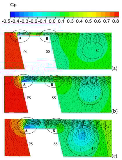 Reverse flow existing at the blade SS (Label C) was closely related to the SS vortex mentioned in Figure 7. With the growth of the tip gap, the reverse-flow area greatly expanded, indicating a fierce formation of the SS vortex in this position, especially at δ = 0.75%. As discussed above, vortices, as well as inverse direction vectors, can be identified by low-Cp regions. A considerable change in SS vortex intensity can clearly be seen in Figure 8a,c, where reverse flows were inappreciable and significant, respectively. In an experimental study conducted by Wu et al. using the PIV method, the existence of adverse flow near the suction side of a water-jet pump was proved by plotting the circumferential vorticity distribution at the tip-gap region [6]. Nonetheless, the authors only stated the employment of vorticity visualization for examining the flow structure at tip clearance with a single clearance value instead of showing the relationship between TCS and vortex strength, as in the present study.