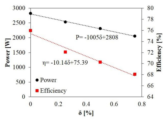 Relationship between power, efficiency, and tip-clearance size in design conditions.