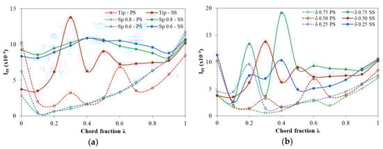 Figure 12 demonstrates the alteration of pressure fluctuation intensity for a series of monitoring points along the turbine blade from the leading to the trailing edge under the design flow rate. The strength of pressure variation of 66 points located at three spans, namely, tip span, 0.8 span (80% of blade height Hb), and 0.6 span (60% Hb) in the case of δ = 0.5% is displayed in Figure 12a. The most salient feature is that pressure fluctuation intensity in SS overwhelmed that in PS at all spans. This phenomenon was appropriate to the results shown in Figure 7, where the SS vortex developed stronger than the PS vortex. Results showed that pressure instability was most obvious at the blade tip, especially in the suction side, with the highest value peaking at λ = 0.3, where the SS vortex initially formed. Due to the evolution of the SS vortex along the blade length, the pressure at blade tip SS drastically varied. Whereas, pressure fluctuation intensity at the tip span of the blade PS was considerably lower except for a noticeable point at the tip leading edge. At this position, Ipf achieved the maximal value of 0.01, revealing that the PS vortex incepted there, and it induced vigorous turbulent flow at the tip corner of the blade PS. The characteristics of the pressure fluctuation curves at 80% and 60% Hb were similar. At the SS, Ipf witnessed no significant change in magnitude along the blade chord. Nonetheless, Ipf at PS was opposite, which was relatively low in the first half and stably increasing in the second half of the blade length. This can be explained by the interaction of the SS vortex from the adjacent blade since it developed along the blade chord, went through the middle channel, and impinged on the PS of another blade.