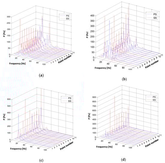 Fast Fourier transform (FFT) was performed with the pressure data of 22 monitoring points along the blade tip chord (11 points in each side, namely, PS1–11 and SS1–11) for four cases of tip clearance. FFT results on frequency property are displayed in Figure 13. Pressure oscillations in SS, represented by red lines, were much higher than those in PS (blue lines) at most positions along the blade tip. The high intensity of pressure alteration occurred not only at leading edge and trailing edge (in the case of δ = 0%) but also at some other locations, particularly at λ = 0.3 and 0.4, corresponding to points SS4 and SS5 in turn, proving that the existence of a tip vortex at these positions contributed to pressure instability on the blade. The level of pressure fluctuation also increased according to the extension of tip clearance. The maximal pressure fluctuation amplitude for δ = 0%, δ = 0.25%, δ = 0.5%, and δ = 0.75% was 286, 398, 600, and 842 Pa, respectively. For a tip gap of 0.75%, the intensity of dominant frequency was considerably augmented, being 3 times higher than the data in the case of zero clearance. Although blade loading depends on the main flow discharge rate, it is also affected by leakage flow over the tip gap. When tip-clearance size was enlarged to δ = 0.5% and δ = 0.75%, leakage flow was strengthened with extreme vortices, harmfully impacting blade pressure stability. Liu et al. found the same phenomenon in a mixed-flow pump and concluded that, when TCS increased from 0 to 1 mm, the maximal amplitude of pressure fluctuation dramatically rose within the impeller, especially on the blade tip [11]. In the turbine here investigated, the detailed figures of the maximal amplitude of Ipf and dominant frequency for different TCSs can be found in Table 3. For four TCS values, tip pressure fluctuated the most at similar dominant frequencies, ranging from 16 to 18 Hz, which is approximately 2.4 times the rotating frequency of the turbine blade. Therefore, TCS exerted negligible influence on the dominant frequency of pressure variation in the surveyed propeller turbine. In a study of a pump-jet propulsor, Yu et al. also claimed that the tip-clearance effects did not change the frequency of thrust and torque variations, but it significantly influenced the fluctuation amplitude [29]. When the tip-gap expanded from 0 to 1 mm, the dominant frequency was almost constant as 75 Hz, while the maximal pressure fluctuation amplitude grew up from 400 to 1000 Pa. This similar observation raised a point that the dominant frequency of pressure alterations might only depend on machines type and working conditions. In contrast, the pressure stability on the rotor blade was deeply affected by TCS.