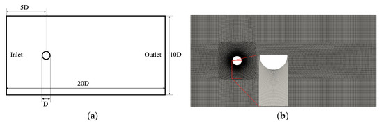 Figure 1a shows the computational domain of the case. The cylinder diameter (D) is 0.1 m, and the distance between the upper and lower boundaries is , and the cylinder is located at the center of the upper and lower boundaries. The Inlet boundary is at of from the cylinder and from the Outlet boundary. This domain size is large enough to prevent the sidewall boundary from affecting the flow past the cylinder.