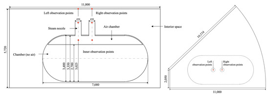 Front and top views of the computational domain of the pressurizer relief tank (PRT) steam dumping process (all geometric parameters are in mm) [12]. There are 6 sampling points in the figure, 3 on the left and 3 on the right, which are, respectively, located inside the PRT, at the nozzle, and at the top of the shell. These points are represented by symbols as Lp-top, Lp-nozzle, Lp-inner, Rp-top, Rp-nozzle, and Rp-inner.