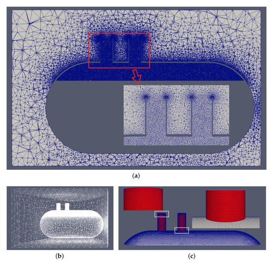 The numerical mesh of the steam dumping process of the PRT, in which panel (a) is the mesh at the cross section, panel (b) is the overall grid, and panel (c) is the mesh detail of the gas chamber of the PRT. The mesh contains 573,583 points, 6,450,280 faces (6,286,476 internal faces), and 3,184,189 cells, which are tetrahedra.