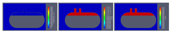 The physical parameters of the case are divided into two parts. First, in the space inside the PRT, only the gas chamber is considered. The velocity is only 1 m/s in the z direction, the pressure is 1.6 MPa, and the temperature is 473 K (199.85 °C). Second, in the outer space of the PRT, the velocity is 0 m/s, the pressure is 0.1 MPa, and the temperature is 298 K (24.85 °C). Figure 4 shows the distribution of velocity, pressure, and temperature in the initial state.