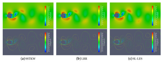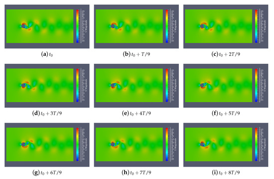 As shown in Figure 1b, the numerical mesh contains 171,864 points, 341,532 faces (169,668 internal faces), 85,200 cells, and seven boundary patches, and the cells are all hexahedrons. The mesh near the cylinder wall region is refined to satisfy . At the same time, the wall functions, such as kqRWallFunction, epsilonWallFunction, and omegaWallFunction, are used to solve the turbulence variables at the boundary.