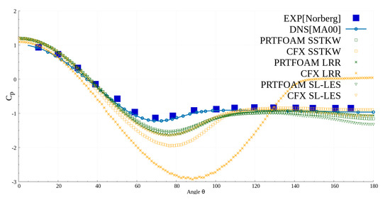 As a benchmark case, the case of flow past a circular cylinder (Re = 3900) is a widely used case. The main purpose of setting a benchmark case is to verify the solving process and the capability for integrating different turbulence models in our open source-based numerical solver. Benefiting from the highly modular object-oriented design, the main numerical calculation process and the turbulence model implementation in OpenFOAM are independent of the fluid properties. Specifically, all of the turbulence models in OpenFOAM are inherited from the abstract class TurbulenceModel, and there is technically no difference between the compressible and incompressible flows.