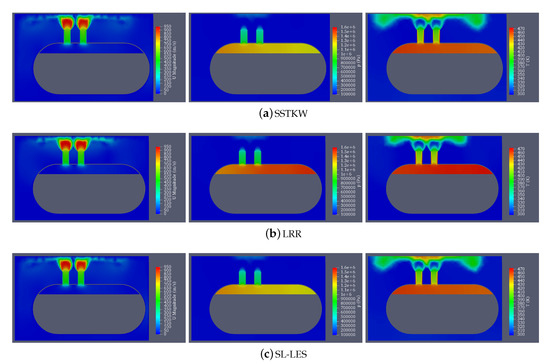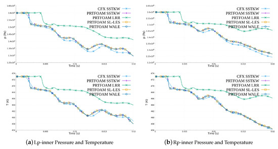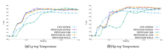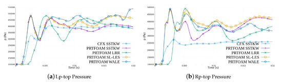 Through the above comparison, we found that the SST k- model and the Smagorinsky–Lilly SGS model-based LES approach are more appropriate than the LRR model for PRT simulations. Moreover, the open source solver PRTFOAM could be used to obtain better results than CFX in complex engineering cases. Only the SST k- model of CFX can converge to obtain simulation results, while the three models based on PRTFOAM can all converge. At the same time, there are some problems in the results of CFX SSTKW, that is, the pressure at the Lp-top and Rp-top sampling points is greatly different. Compared with different models, we found that the simulation results of the LRR model are not very ideal. First, the time of pressure and temperature drop during the steam dumping process lags behind that of other models, and second, the rate of pressure temperature drop is relatively slow. Fortunately, the results of the SST k- model and the results of the Smagorinsky–Lilly SGS model are generally consistent and desirable. However, the entire simulation time of the Smagorinsky–Lilly SGS model is almost twice as long as that of the SST k- model. This is why the RANS model based on the Reynolds average can still survive after the large eddy simulation (LES) is proposed.