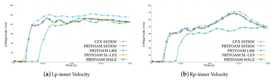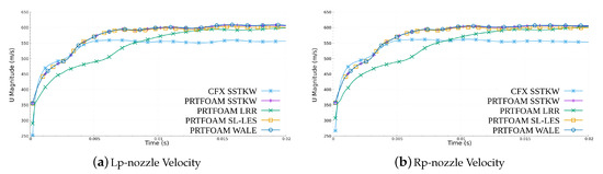 Velocity–time curves of the simulation results of different models at the (a) Lp-nozzle and (b) Rp-nozzle sampling point. The curves of PRTFOAM SSTKW, PRTFOAM SL-LES, and PRTFOAM WALE basically coincide. The velocity at the nozzle gradually increases with the steam dumping process and finally stabilizes at approximately 600 m/s.