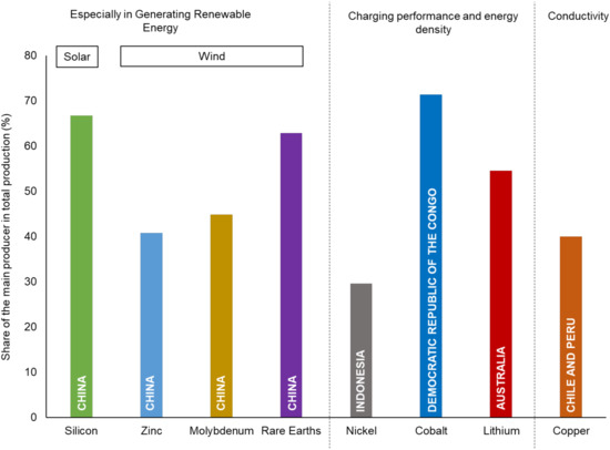 Fikse et al. [23] stated that traditional system engineering practices attempt to anticipate disruptions; however, they may be susceptible to unforeseen factors. This is particularly reflected in the unexpected outbreak and impact of COVID-19. The disease threatens human life while also serving to highlight existing or potential vulnerabilities of emergency responses and various system designs (i.e., capacity, allocation, and flexibility). A sustainable system design with inherent resilience would likely be valuable in future research. One of the apparent crises during COVID-19 is the shortage of personal protective equipment, particularly in countries reliant on international production. Global value chains may be reconsidered after the COVID-19 outbreak, as suggested by Kambhampati [24], due to the profound risk they pose. COVID-19 has also had an influence on the energy system. Figure 2 shows the supplies of minerals that support energy production. In addition to Cu, Li, Co, and Ni, renewable energy used Si, Zn, Mo, and rare earth minerals, which are non-renewables. It has been reported that electric cars use five times more minerals than a conventional car, and onshore wind plants require eight times more minerals compared to gas-fired plants [25]. As shown in Figure 2, the production of Si, Zn, Mo, and rare earth minerals is dominated by China. The reliability, security, and price fluctuations of mineral supplies is an under-analysed global challenge in the promotion of a 100% renewable energy future.