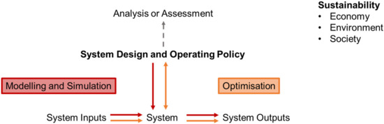 The research direction of sustainable system design. Modified based on Loucks [40]. The considered tools reviewed in this study include those used for modelling and simulation, optimisation, and analysis or assessment, that can contribute to energy system design. Red arrows represent modelling and simulation. Orange arrows represent optimisation. The grey arrow represents analysis or assessment. For example, modelling and simulation utilise system inputs and the available system design and operating policy to identify the system outputs. Analysis or assessment is conducted to determine the performance of an existing system.