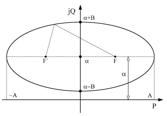 Equation (17) shows that the trajectory of the complex power has the shape of an ellipse and is depicted in a complex plane, as in Figure 3 [9,10]. The ellipse in Figure 3 shifts up with α along the reactive power axis, and α is the value obtained from the transmission line parameters and voltages at both sides, as shown in (16).