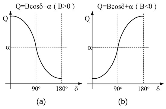 On the other hand, the reactive power Q and generator angle δ are related as Q = B.cosδ + α, as shown in (14), where B can be either positive or negative. When B is positive, the reactive power Q decreases from B + α to −B + α as the generator angle δ increases from 0° to 180°, as shown in Figure 6a. In this case, the reactive power is inversely proportional to the generator angle. However, when B is negative, the reactive power is proportional to the generator angle. From 0° to 180°, the reactive power changes along the cosine curve, as shown in Figure 6b. When the generator angle is larger than 180°, the generator angle is increased as the reactive power is decreased. Therefore, it can be used within the generator angle range of 0° to 180°.