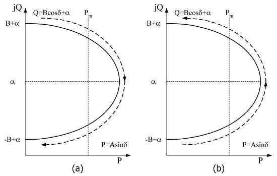 Constants A and B (Equations (12) and (14)) are determined when the line parameters and the voltages at both ends of the line are known. As previously mentioned, A is always non-negative, while the sign of B is not restricted. Figure 7 shows the trajectory of the complex power as a function of the line parameters when generator angle δ is increasing. The difference between Figure 7a,b is in the direction of the trajectory of the complex power dependent on the sign of B, written as follows:
