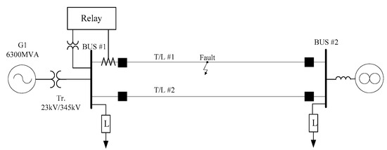 A simulation was carried out with a three-phase fault in the middle of one of the lines, causing the out-of-step condition. The test was repeated with various fault clearing times. The initial value of the generator angle was 30°. The simulation system was a reduced version of the actual power system, and the fault condition and operating conditions were selected in consideration of the real power system in Korea. A Synchronous Machine (SM) card and Transient Analysis on Control Systems (TACS) in EMTP were utilized, along with the parameters of the governor and excitation system of the “A” nuclear power plant in Korea [12,13,14,15].